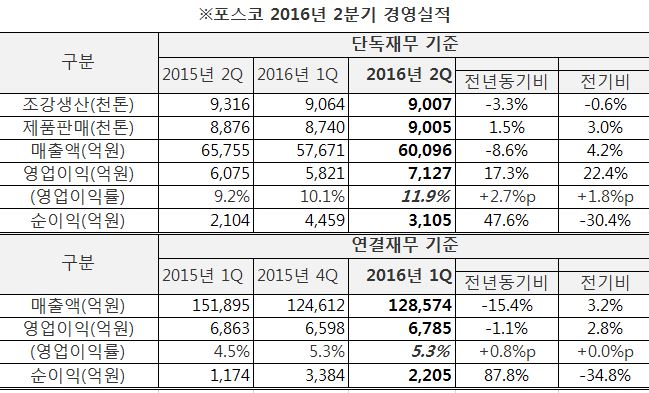포스코는 올해 2분기 단독재무 기준 매출 6조96억원, 영업이익 7,127억원을 달성했다. 연결기준으로는 매출 12조 8,574억원, 영업이익 6,785억원을 기록해 양호한 성과를 나타냈다.
