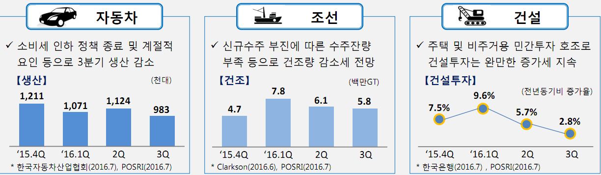 3분기 국내 수요산업 전망은 건설을 제외한 자동차, 조선 산업에서 고전을 면치 못할 것으로 보인다.