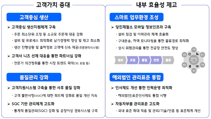 더불어 당진제철소에 모바일 정보인프라를 구축해 구내 운송 및 하역 모니터링을 통해 물류경로를 최적화했다. 해외법인의 경우 표준인사제도로 통합해 인력운영을 최적화하고 있으며 자동차부품 관리표준체계를 개선하면서 관리표준 통합에 나서고 있다.
