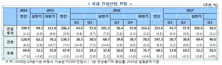 포스코경영연구소(POSRI)가 발표한 '3분기 국내철강수급전망'에 따르면 2016년 건설투자는 2015년 이후 과열현상을 보인 주택수주 호조세가 올해 건설투자에도 긍정적인 영향을 줄 것으로 예상했다.