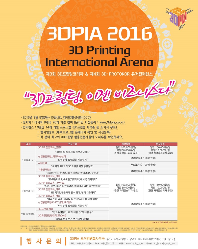 산업통상자원부와 미래부(정보통신산업진흥원), 특허청과 대전광역시, 경상북도, 전라북도, 구미시 등의 4개 지자체 및 3D관련 기관 및 단체가 후원하고, 3D프린팅산업협회(회장 김영형)이 주최하며, 스토리앤플랜(대표 김대수)이 공동 주관하는 ‘3DPIA 2016’은 아시아 최대 규모의 유저컨퍼런스와 전시회이다.