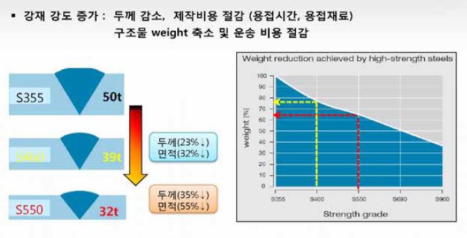 최근 조선시장은 컨테이너선 대형화와 가스 운반선 발주가 늘고 있고 해양플랜트 시장은 원해ㆍ심해ㆍ극해로의 자원 개발이 늘면서 이에 필요한 강재 특성이 고강도, 고인성화가 빠르게 진행되고 있다.