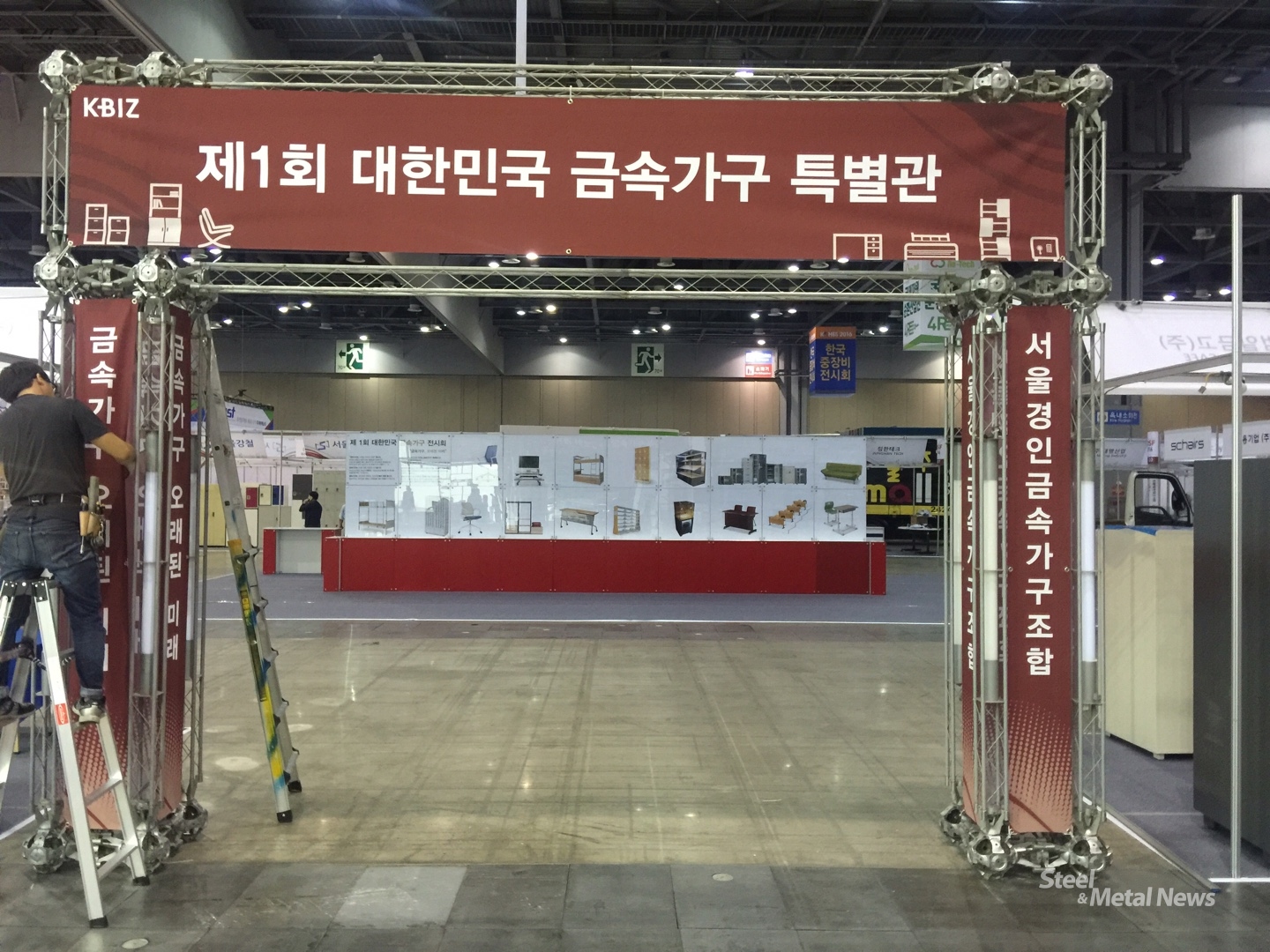 금속가구의 우수성을 알릴 '제1회 금속가구전시회'의 개막을 앞두고 서울경인금속가구조합의 회원사들이 막바지 작업에 한창이다.