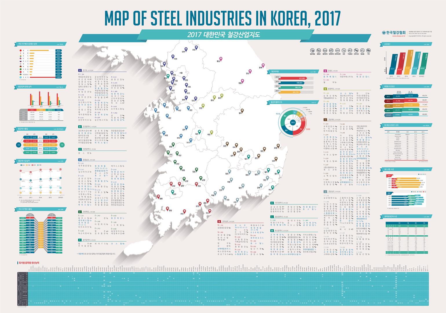 이번에 제작된 2017년판 철강산업 지도에는 국내에서 철강제품을 생산하는 300여개 철강사의 위치와 제품별 생산 능력이 수록 되어 있다. 지도에 표기된 철강생산업체 300여개사는 2009년 철강산업 지도를 제작한 이래 가장 많은 업체가 수록됐다.