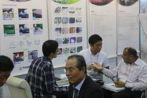 일산 킨텍스에서 열리고 있는 철강금속산업전에 참가하고 있는 부곡스텐레스에 해외 바이어들의 발길이 끊이지 않고 있다.