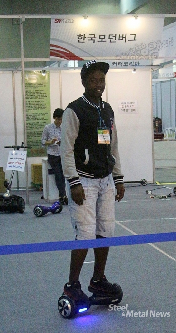 ▲ 한국 모던버그가 선보인 개인용 이동수단인 스믈링을 타고 있는 한 외국인 관람객.