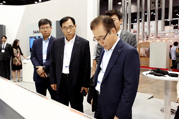 세아그룹 이순형 회장은 29일 해외 출장에서 막 도착한 이주성 전무를 대동하고 킨덱스 전시장을 찾았다.