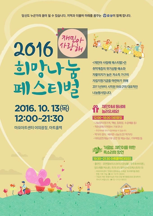이번 행사는 초청 가수와 함께 하는 '희망나눔 콘서트', 관내 기업 및 주민들의 기부 물품으로 진행되는 '나눔장터' '착한 경매' 등 다양한 프로그램으로 이뤄졌으며, 수익금은 마포구청의 꿈나무키우기 사업 및 주거∙교육∙창업 지원 사업 등에 사용될 계획이다.