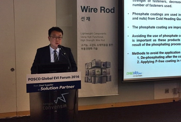 1일 인천 송도컨벤시아서 개최된 포스코 글로벌 EVI 포럼의 선재 세션에서는 인산염피막과 유사한 성능을 발휘하면서 인성분이 제거된 비인피막처리를 통해 냉간압조용강선을 제조하는 현장 처리기술과 이를 이용한 냉간단조 시험결과를 소개했다.