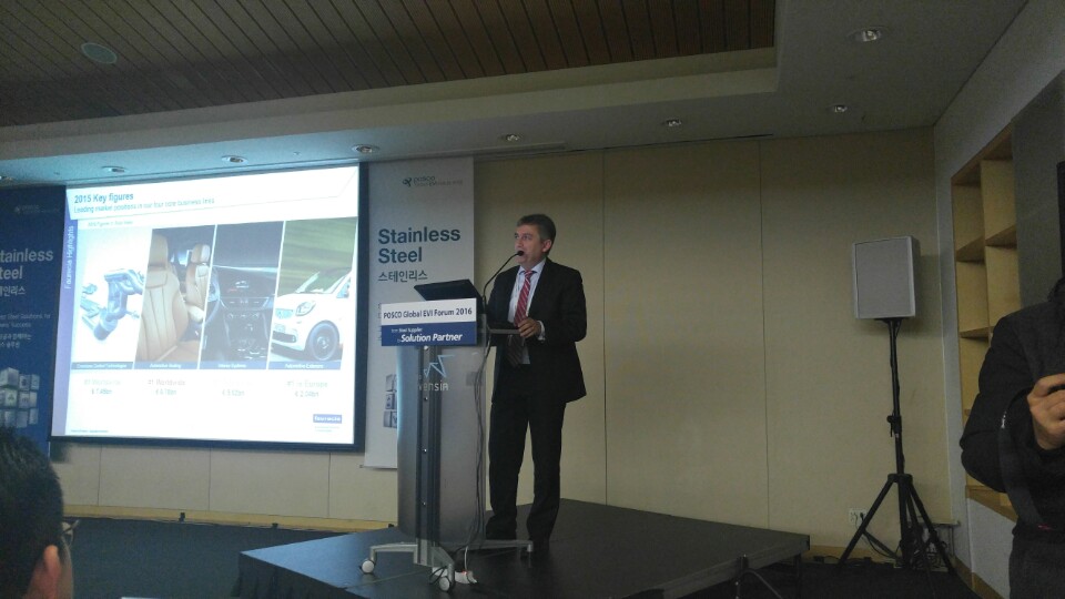 포스코 EVI 포럼에서 포레시아 Ramirez 이사는 글로벌 자동차 배기시스템 시장과 기술동향에 대해 주제발표를 했다.