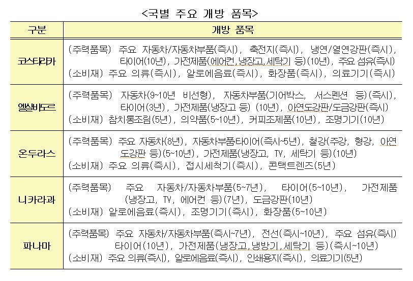 중미측은 자동차, 철강, 합성수지 등 우리 주력 수출 품목뿐 아니라, 화장품, 의약품, 알로에음료, 섬유(편직물, 섬유사), 자동차 부품(기어박스, 클러치, 서스펜션 등) 등 우리 중소기업 품목들도 대폭 개방했다.