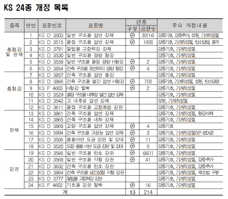 주요 개정내용을 보면 KS D 3503(일반 구조용 압연 강재)등 24종의 KS 항복강도 기준을 유럽 표준(EN)과 동등한 수준 이상으로 강화하는 한편, 강종기호 기준을 종전의 인장강도(TS)에서 설계에 활용이 쉬운 항복강도(YP)로 변경하였다. 또한 KS D 3515(용접 구조용 압연강재)에는 저온 충격시험 항목을 추가해 영하 40℃에서도 보증되는 고품질의 제품 생산을 유도키로 했다.