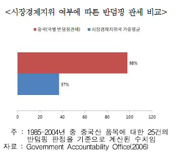 보고서는 "미국, EU, 일본 등 수입국은 중국에 시장경제지위를 부여하게 되면 과거만큼 높은 반덤핑 관세를 부과할 수 없다는 점을 우려한다"며 "반면 중국은 시장경제지위를 인정받아 그간 고율의 반덤핑에서 벗어나고 싶어 한다"고 설명했다. 중국은 이와 관련한 사안을 WTO 상소 등 강경한 방식으로 풀어나갈 가능성이 큰 것으로 전망된다.