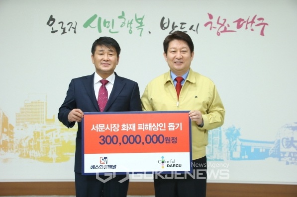 이를 위해 에스와이패널은 지난 19일 대구시청 시장접견실에서 권영진 대구시장을 만나 총 3억원의 서문시장 화재 피해 상인 돕기 성금 전달식을 가졌다.