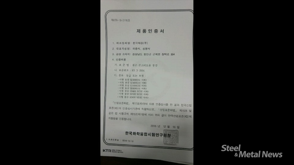 한국제강 관계자는 “이번 KS인증을 통해 고품질·고급 철근 생산에 더욱 주력할 것”이라며 “경쟁력 있는 제품을 만들기 위해 최선을 다할 것이다”고 밝혔다.