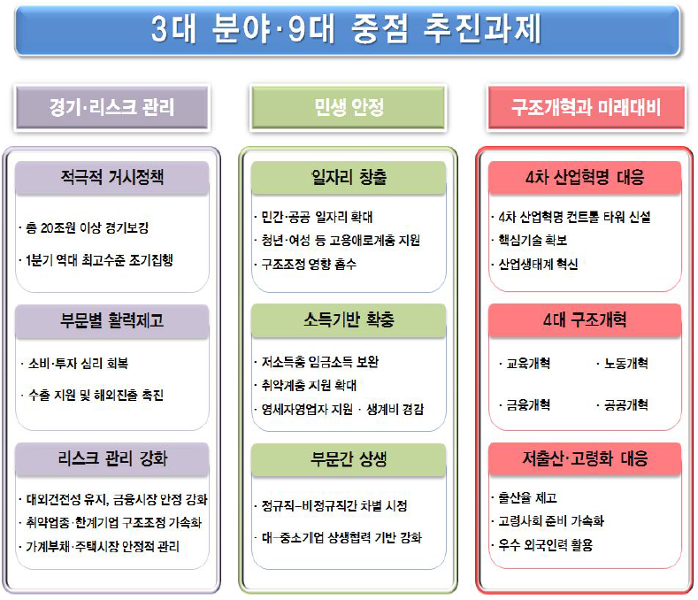 발표에 따르면 정부는 2017년 초 경기 위축 가능성에 대응하기 위해 13조원 이상으로 지출을 확대하고 1/4분기에 역대 최고 수준(계획 기준)의 조기집행을 추진한다. 이를 바탕으로 경제 부문별 활력을 제고하고 구조조정 영향을 흡수하는 등 민생 안정에 총력을 기울인 다는 것이 큰 그림이다.