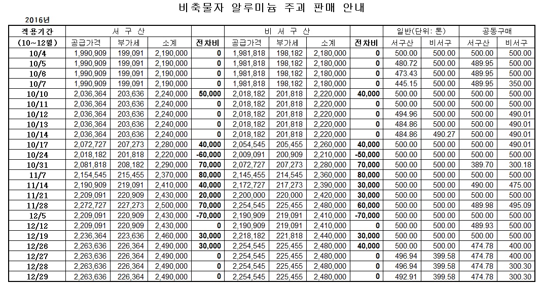 조달청 알루미늄 방출 가격 추이(10~12월)