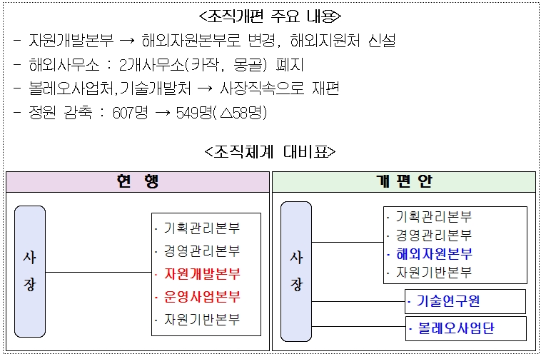 이번 개편으로 광물공사는 기존의 운영사업본부를 기술연구소와 볼레오 사업단으로 분할하여 5본부 12처단 46실▪팀에서 4본부 12처 44실▪팀으로 조직규모를 일부 축소했다.