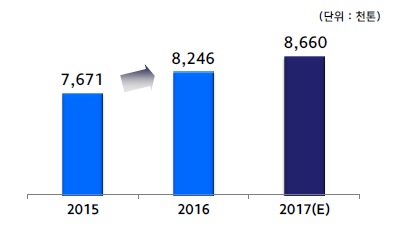전략제품 판매량은 2015년 767만1,000톤에서 2016년 824만6,000톤으로 증가했으며 2017년에는 866만6,000톤까지 늘어날 전망이다.