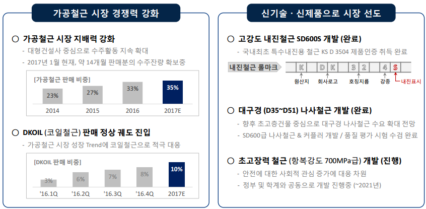 고강도 내진 철근인 SD600, 대구경(D35~D51) 나사철근을 성공적으로 개발했고, 초고장력 철근(항복강도 700MPa급)은 현재 개발단계에 있는 등 신기술·신제품으로 시장을 선도했다.