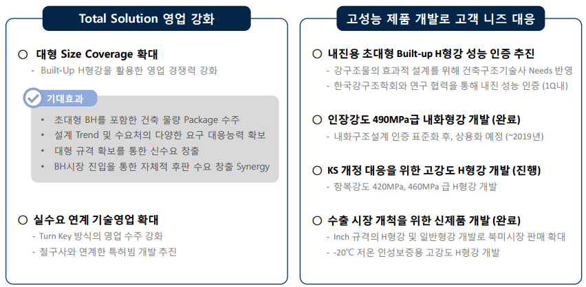 초대형 BH빔, 내화형강, 고강도 H형강 등 다양한 고성능 신제품을 개발해 고객의 수요에 대응하는 데에 성공했다.
