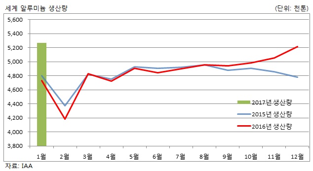 2017년 1월 세계 알루미늄 생산량이 전월과 전년 동월 대비 모두 증가하면서 다시 사상 최대를 기록했다.