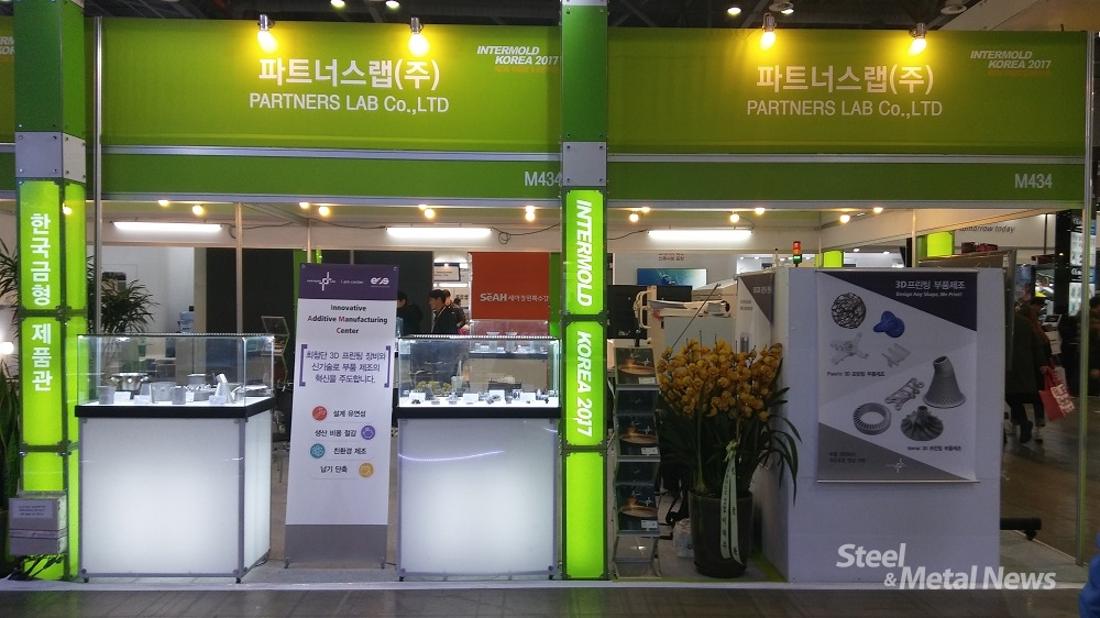 파트너스랩(주)는 11일까지 일산 킨텍스 제1전시관에서 개최되는 ‘인터몰드 코리아 2017’ 전시회에서 3D 프린팅을 활용한 금형과 정밀부품, 산업용 3D프린팅 금속 및 플라스틱 샘플, 초정밀 기계 가공품, 독일 EOS사의 금속 등을 전시 중이다.