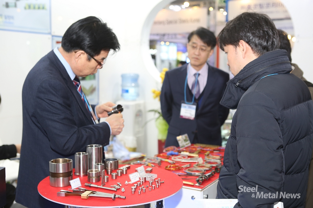 ▲ 가달하이테크 이형훈 대표(좌측)가 고객들에게 금형부품에 대해 설명하고 있다. (사진=송규철 기자)
