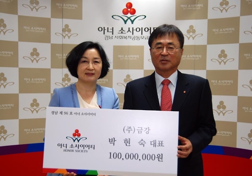 진주시에 위치한 스테인리스 물탱크 제조업체 금강 박현숙(52·여) 대표가 지난 14일 경남사회복지공동모금회를 찾아 성금 1억원을 기부했다. 이번 기부로 박 대표는 1억원 이상 고액 기부자 모임인 '아너 소사이어티'(Honor Society) 경남 96번째 회원에 가입했다.