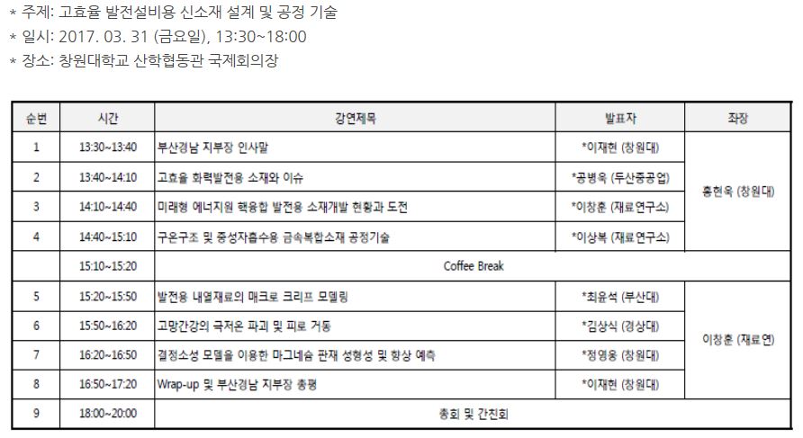 심포지엄 관련된 사항은 창원대 신소재공학부(055-213-3699, huhong@changwon.ac.kr)에 문의하면 된다.