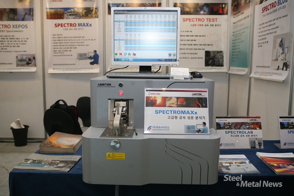 독일 SPECTRO사의 국내 독점 대리점인 (주)유로사이언스는 이번 전시회에서 SPECTRO사의 고급형 금속 성분 분석기 ‘MAXx’를 전시했다. ‘MAXx’는 실험실용 정밀 금속 성분 분석기로 철, 구리, 아연, 니켈, 타이타늄, 망간, 아연, 코발트, 납, 주석 등 10개 강종의 분석이 가능하다. 또 별도의 항온, 항습 장치가 필요 없는 자동 온도 제어 시스템을 채택하고 있으며, 진공펌프가 없는 방식으로 조용한 실험실을 실현할 수 있다.