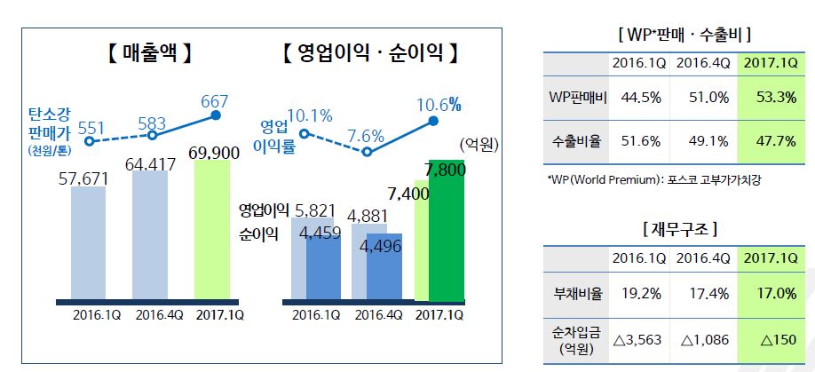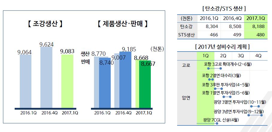 1분기 철강 생산과 판매량은 포항3고로 개수공사의 영향으로 전기대비 감소했다. 1분기 조강생산량은 908만3천톤으로 지난해 4분기에 비해 54만1천톤이 줄었고, 제품생산량과 판매량은 866만8천톤과 866만7천톤을 각각 기록했다. 제품 중에서 탄소강이 818만8천톤, STS가 48만톤씩 생산됐다.