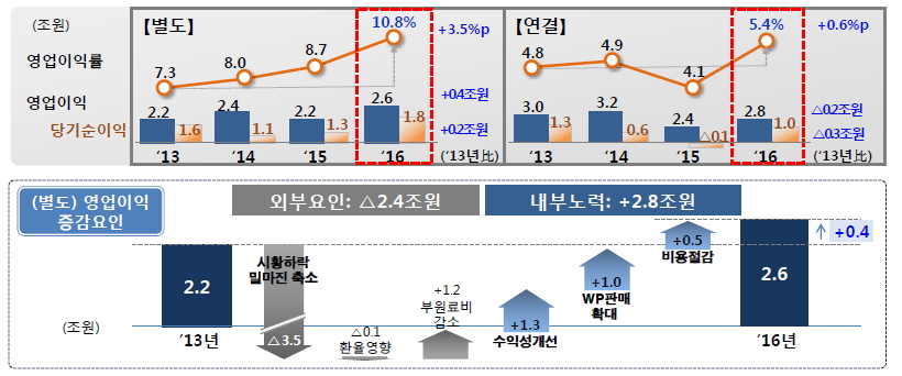 포스코 별도 영업이익률이 작년에 2013년 대비 3.5%p 개선되며 2011년 이후 최초로 두 자리수 영업이익률을 달성했다. 작년 포스코 영업이익 규모는 시황 하락 등 불리한 외부여건에도 내부 노력을 통해 약 4,000억원 늘어났다.