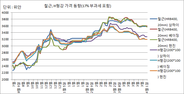 중국 4월 1주차 철근·H형강 내수 가격(17% 부과세 포함)이 횡보를 나타내고 있다.