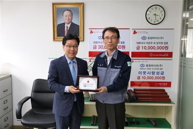 동원파이프는 지난해 12월 모기업 동원금속과 함께 이웃돕기 성급 5,200만원을 기탁한데 이어 서문시장 화재피해에 성금 3,000만원을 전달했다.