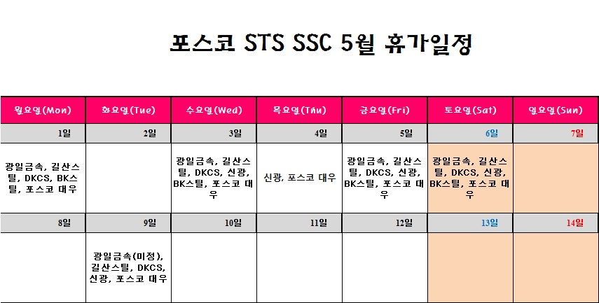 포스코 스테인리스 스틸서비스센터(STS SSC)가 5월 황금연휴기간에 업체 사정에 따라 휴무일이 다른 것으로 확인됐다.