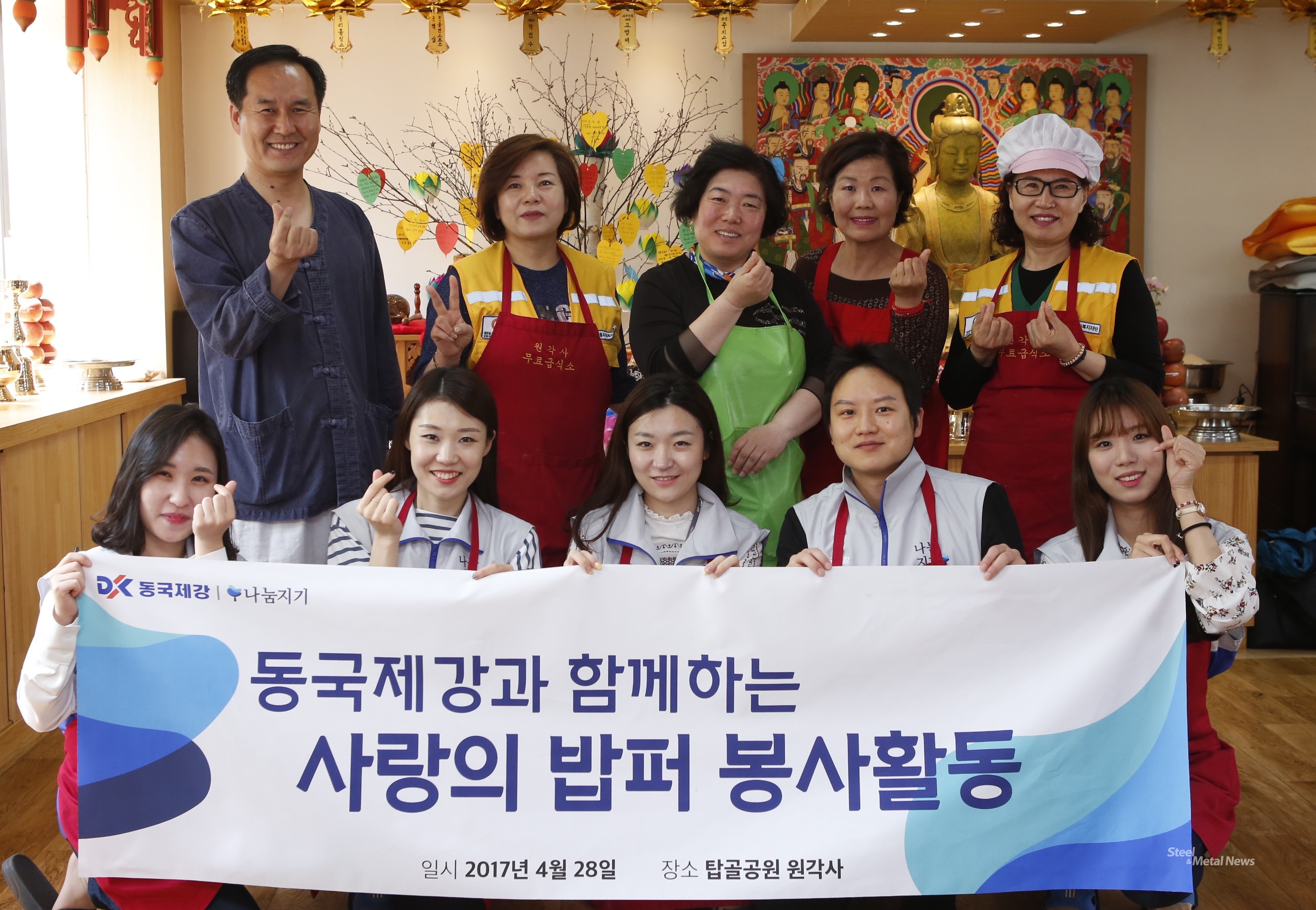 동국제강 ‘나눔지기 봉사단’은 4월 28일 서울 종로구 탑골공원에 위치한 원각사 무료 급식소에서 ‘사랑의 밥퍼’ 봉사활동을 펼쳤다.