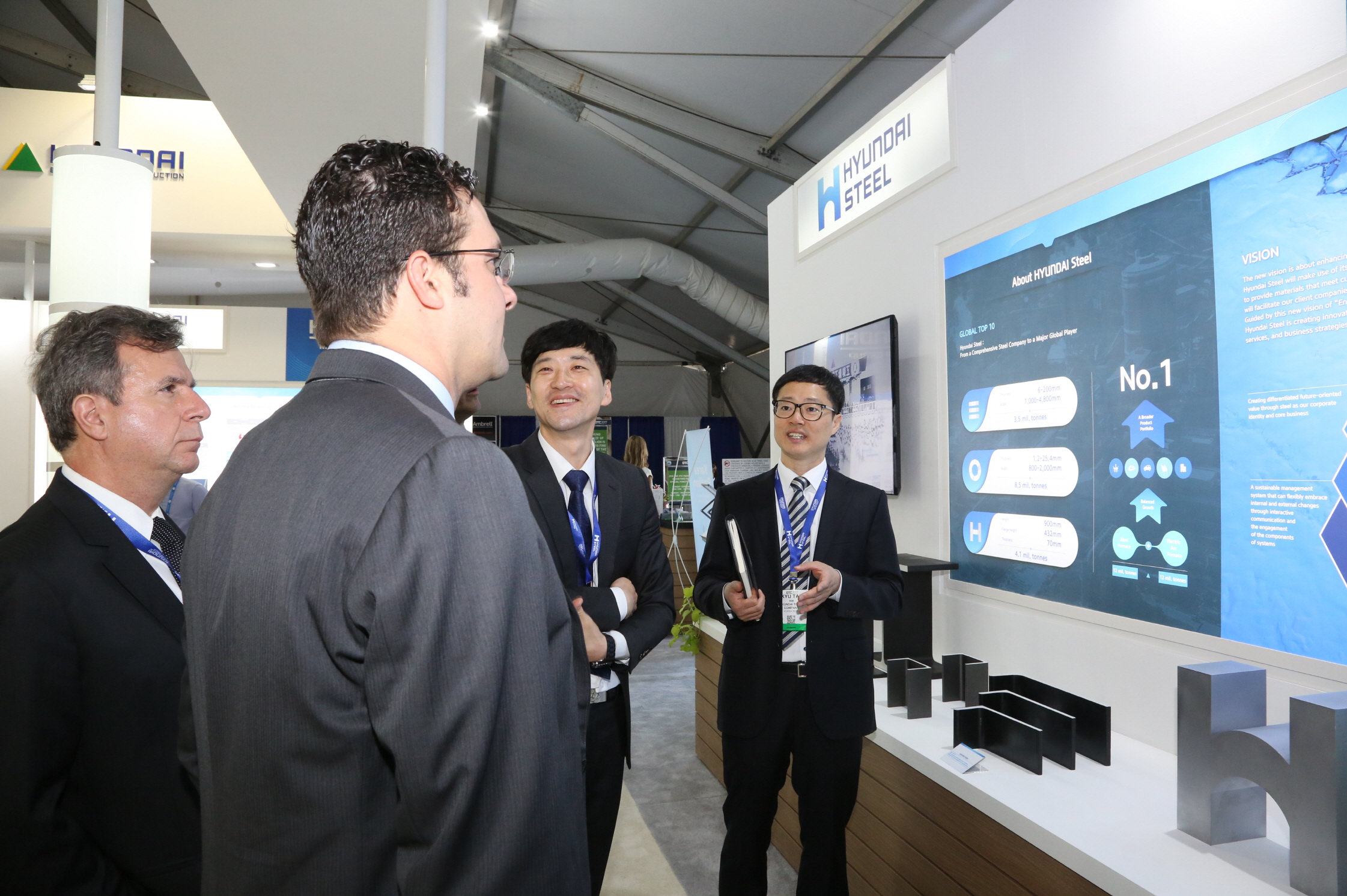 현대제철은 한국 조선해양기자재공업협동조합(KOMEA)과 한국관을 공동으로 마련해 해양구조용 강재의 주요 제품인 고성능 후판, 에너지용 API강재, H형강 등을 선보인다.