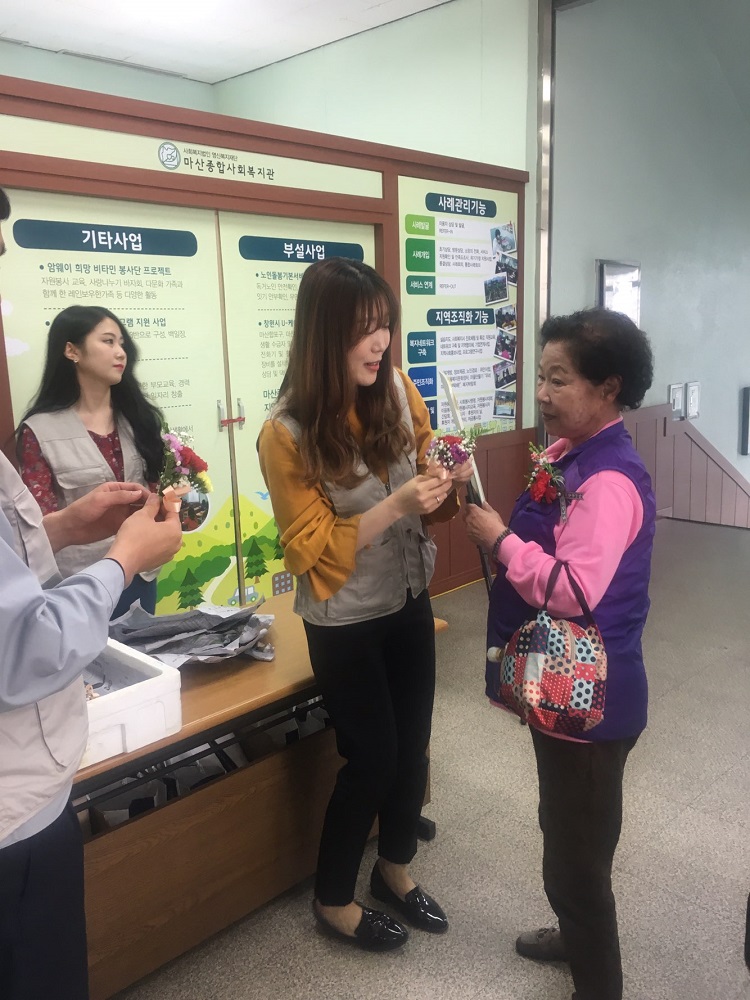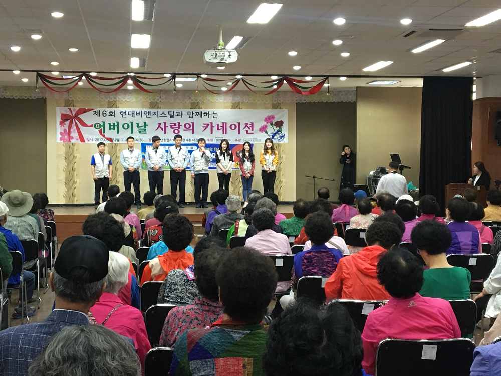 현대비앤지스틸이 8일 어버이날을 맞이해 지역사회 복지관 이용 어르신께 카네이션 달아드리기 행사를 마산종합사회복지관과 함께 진행했다.