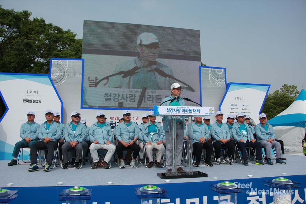 하13일 경기도 하남시 미사리 경정장에서 열린 ‘제 18회 철의 날 기념 철강사랑 마라톤 대회’에서 한국철강협회 권오준 회장은 대회사를 전했다.