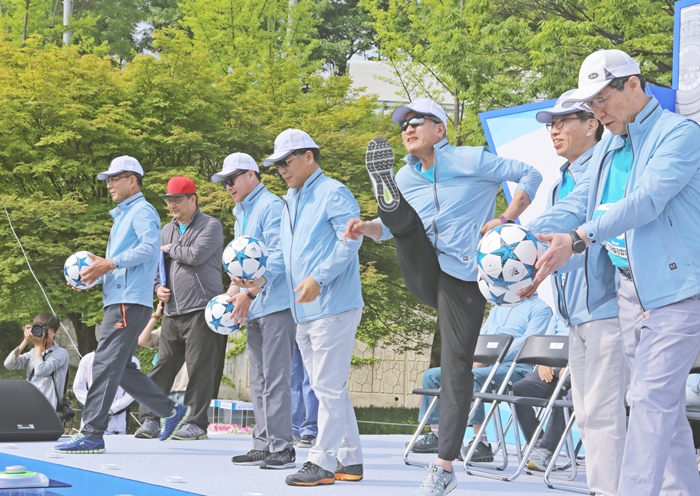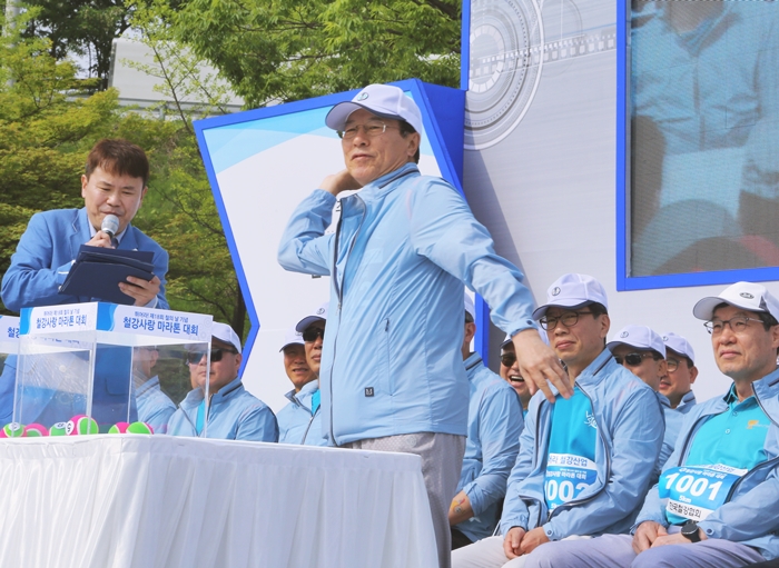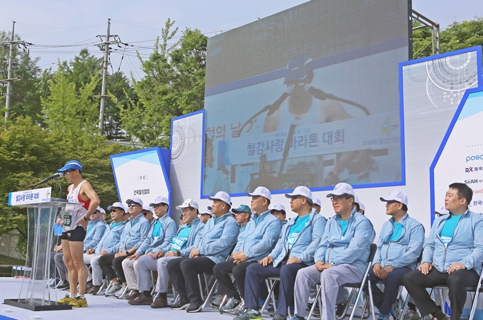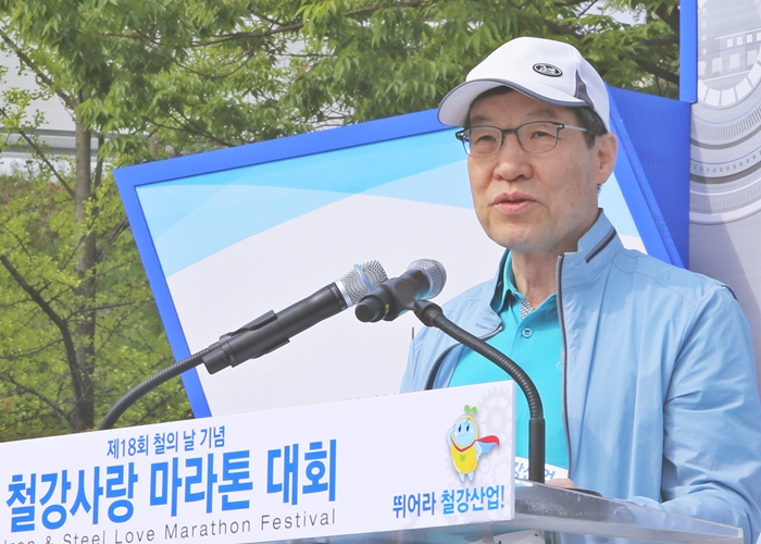 철강사랑 마라톤 대회 행사에 참석한 한국철강협회 권오준 회장을 비롯, 철강업계 VIP들은 '철강사랑 축구공 증정', '미래 철강상 추첨' 등 세레머니를 펼쳤다.