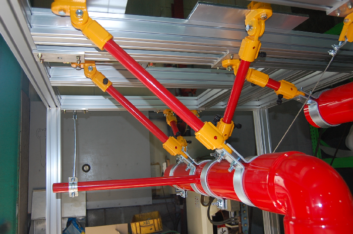 한국방진방음의 흔들림 방지 버팀대는 스프링클러 설비 등 수계 소화설비 배관의 내진 흔들림 방지용으로 50~200㎜ 구경까지 적용할 수 있다. 지지대 강관 스케쥴 40, 구경 25㎜, 32㎜에 사용 가능하고 종 방향과 횡 방향 버팀대는 물론 I-빔에 붙이는 부착장치 성능도 인정받았다.