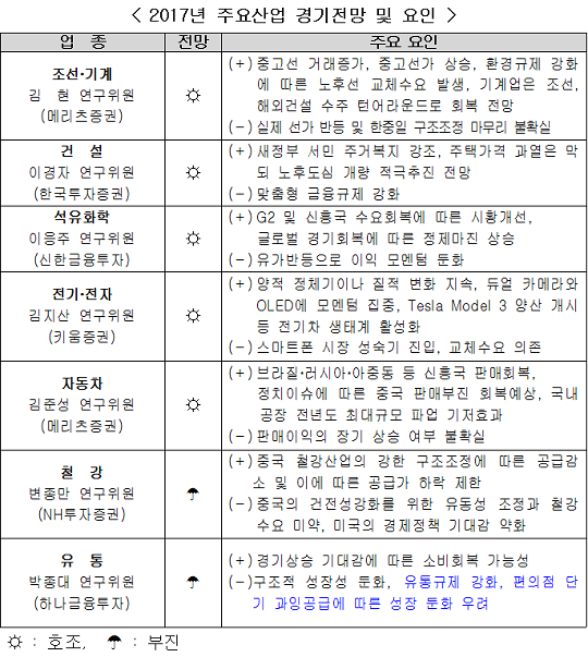 철강업은 중국의 철강수요가 미약한 가운데, 원자재가격 상승 동력 약화로 업황 전망이 밝지 않다. 다만 중국의 강력한 철강산업 구조조정에 따른 공급 감소로 철강가격 하락은 제한적일 것으로 예상된다. 유통업은 고령화, 가처분소득 감소 등에 따른 구조적 성장성 둔화, 유통규제 강화 등으로 업황 부진이 우려된다.