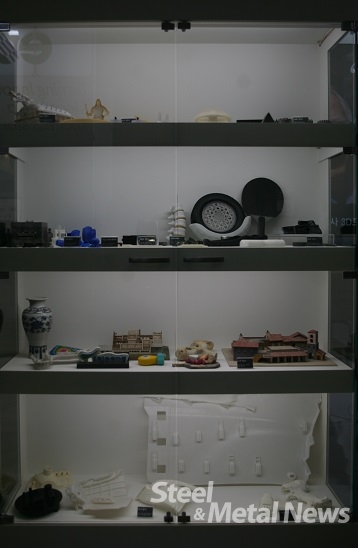 이어 전시장 왼편에 설치된 3D프린팅 출력물을 소개한 백 본부장은 "이미 국내 쥬얼리업계에서는 3D프린팅 왁스 패턴을 이용한 정밀주조 기법을 활용하는 업체가 많다"며 "덴탈 분야와 금형 제조, 석고소재를 활용한 의료용 시뮬레이션 분야에도 3D프린터의 활용이 늘어나고 있다"고 말했다.