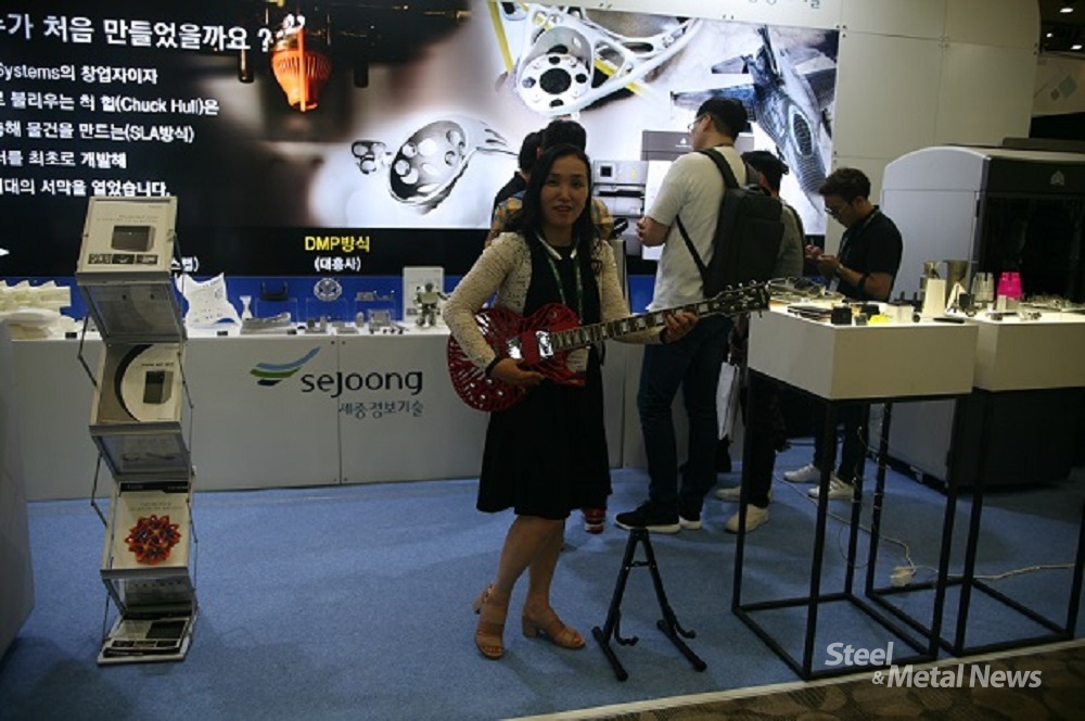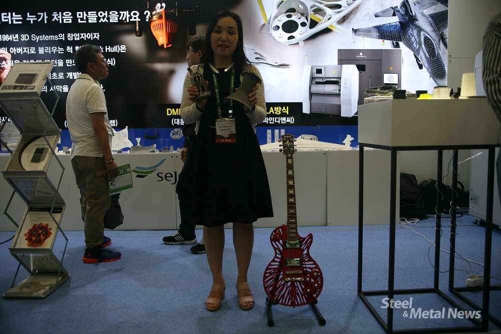 3D시스템즈 백소령 본부장은 전시장 내에 진열된 기타와 출력물을 보이며, 앞으로 3D프린팅 산업의 중심이 시제품 제작에서 직접 양산으로 이동할 것이라고 설명했다.