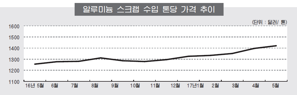 5월 국내 알루미늄 스크랩 수입 평균 가격은 톤당 1,420.7달러로 2015년 8월 이후 21개월 만에 톤당 1,400달러에 올라섰다. 2016년 11월 이후 7개월 연속 상승세다. 지난해 알루미늄 평균 수입 가격은 2016년 9월을 제외하고 한 차례도 톤당 1,300달러를 넘어서지 못한 바 있다. 2016년 연간 평균 수입 가격도 톤당 1,249.2달러에 불과했다.
