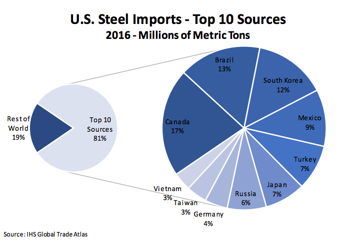 이유는 미국의 철강 수입 상위 10개국을 살펴보면 알 수 있다. 미국은 2016년 캐나다로부터 가장 많은 양의 철강재를 수입했고 그 다음은 브라질, 한국, 멕시코, 터키 순이었다. 미국으로 철강을 수출한 국가 중 중국은 10위 안에 들어있지 않다.
