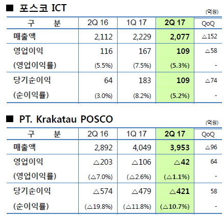 한편 포스코 ICT는 EIC(Electricity, Instrumentation, Computer)부문의 대형설비 공급사업 감소로 인해 매출액과 영업이익이 하락했다.