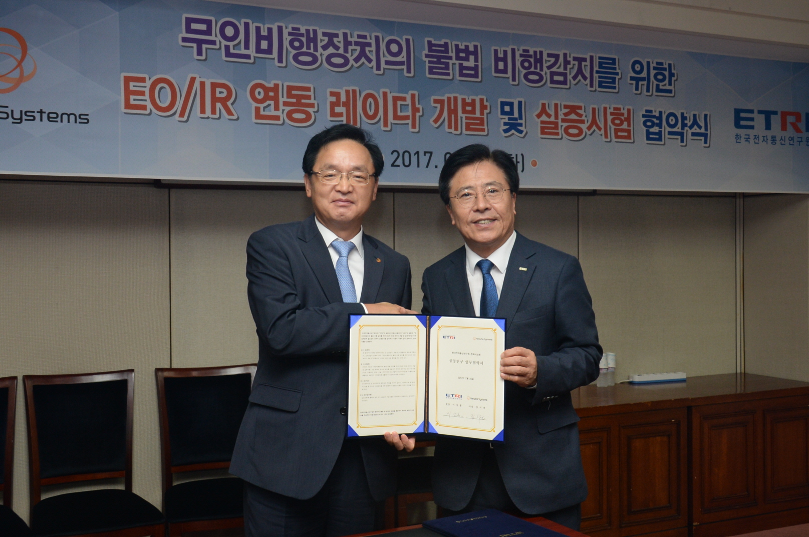 한화시스템과 한국전자통신연구원(ETRI)이 공동으로 드론 탐지용 레이더 개발에 나섰다. 한화시스템과 한국전자통신연구원(ETRI)은 25일 ETRI 대전 본원에서 장시권 대표이사 및 이상훈 원장이 참석한 가운데 무인기 및 드론 탐지용 전자광학·적외선(EO·IR) 연동 레이다의 공동 연구 및 개발 사업을 위한 업무협약을 체결했다.