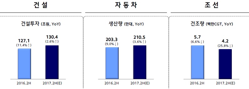 국내 건설산업이 성장을 유지하는 가운데 자동차산업은 성장 전환, 조선산업은 신규 수주가 늘어나고 있다.